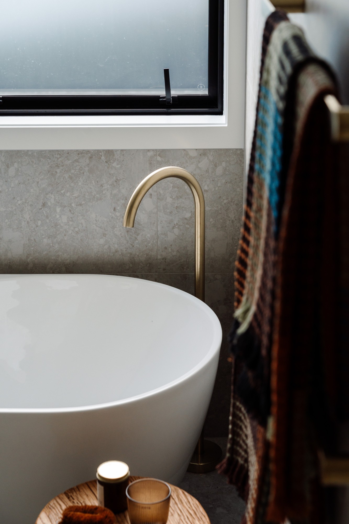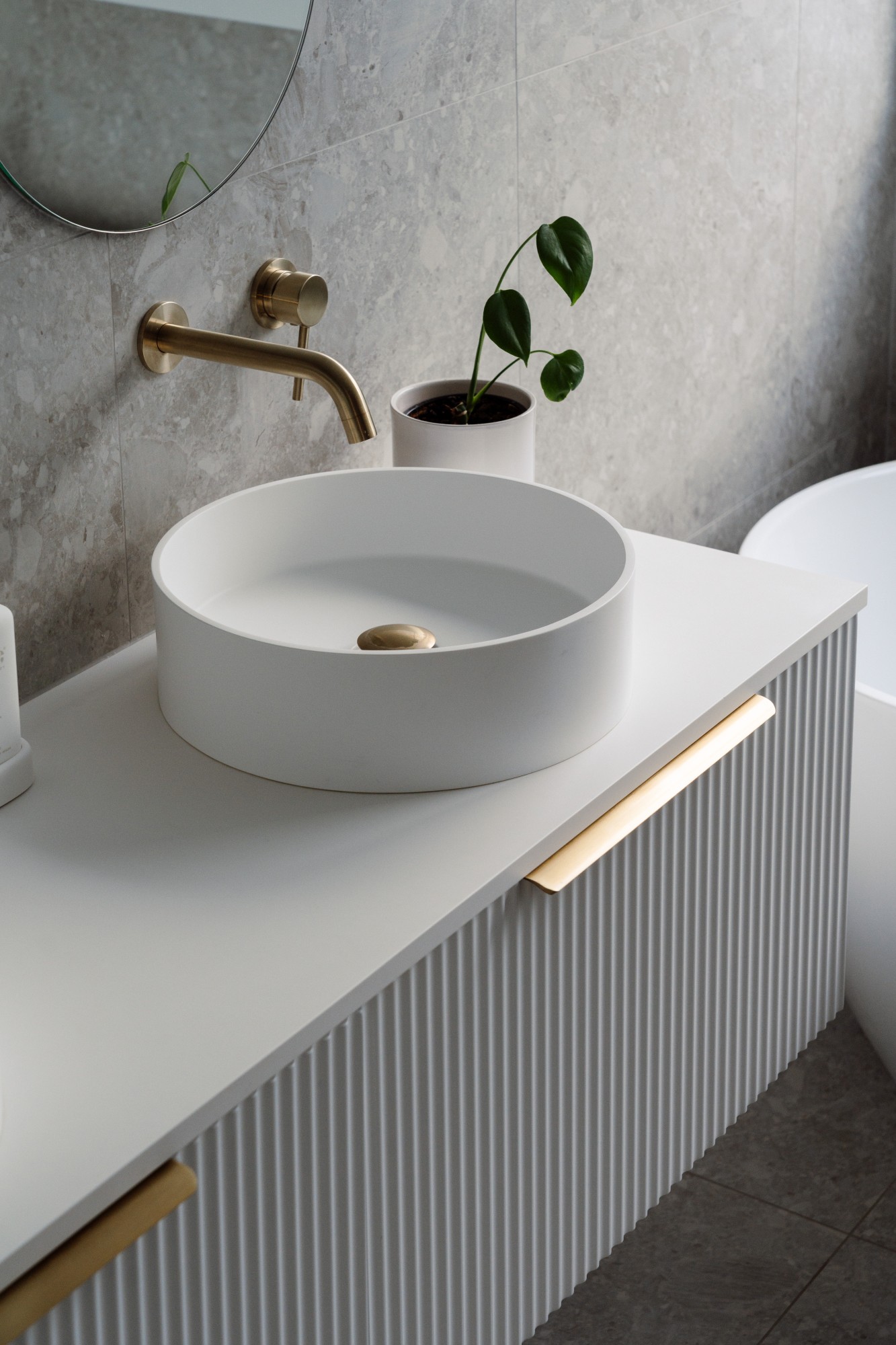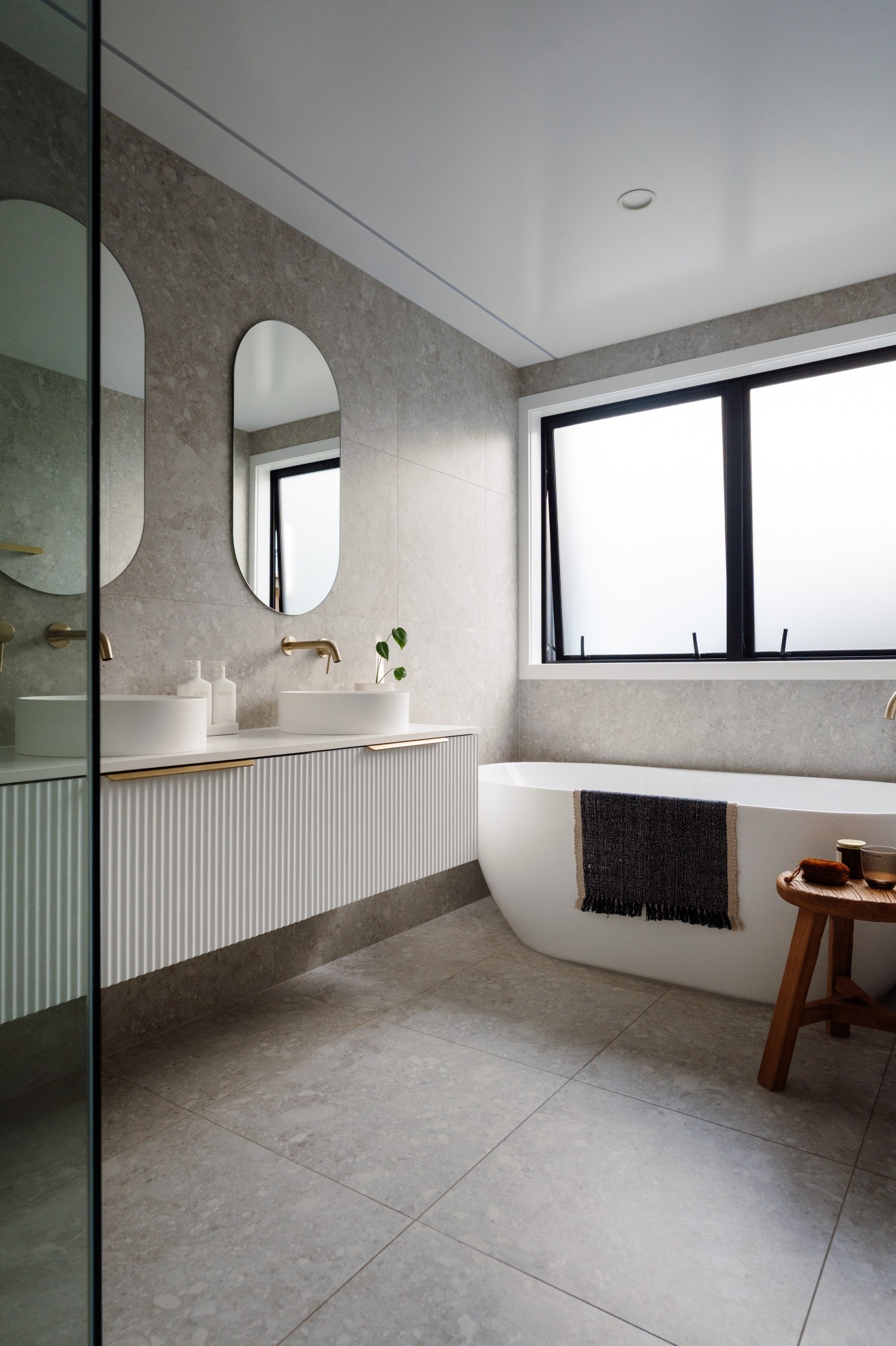 In the bathrooms, the homeowners wanted a soft neutral tile, nothing too dark or light. “This classic subtle terrazzo style tile works in well with the fluted vanity fronts and brass fixtures and tapware to add some more luxury and warmth to the space,” says Nicola. Brass tapware, sink plugs and draw handles complement the fluted rippled feature panels on the vanity drawers. The stone vanity tops were selected for practicality and luxury.