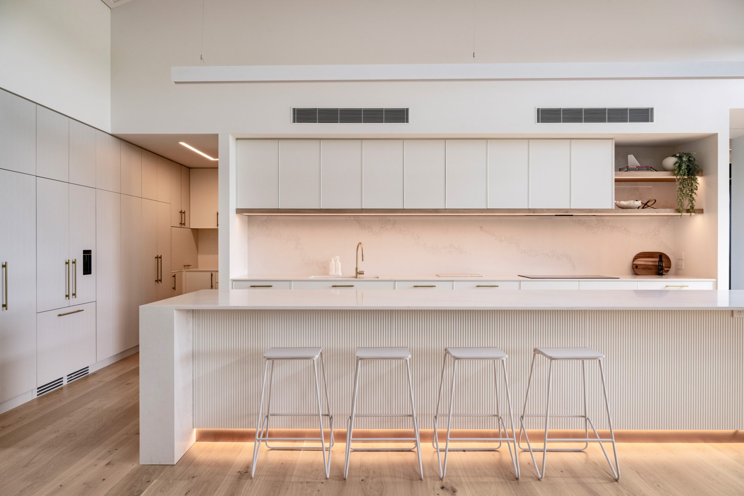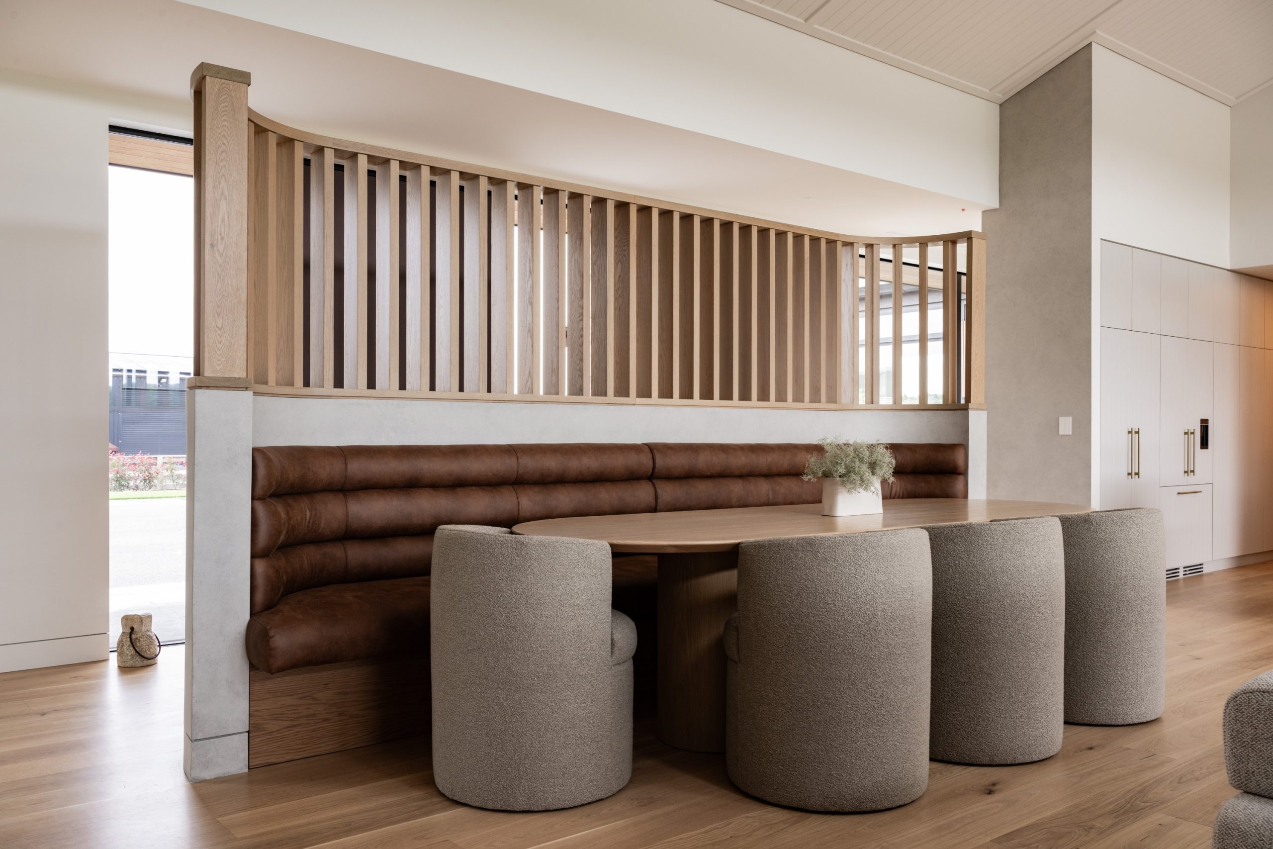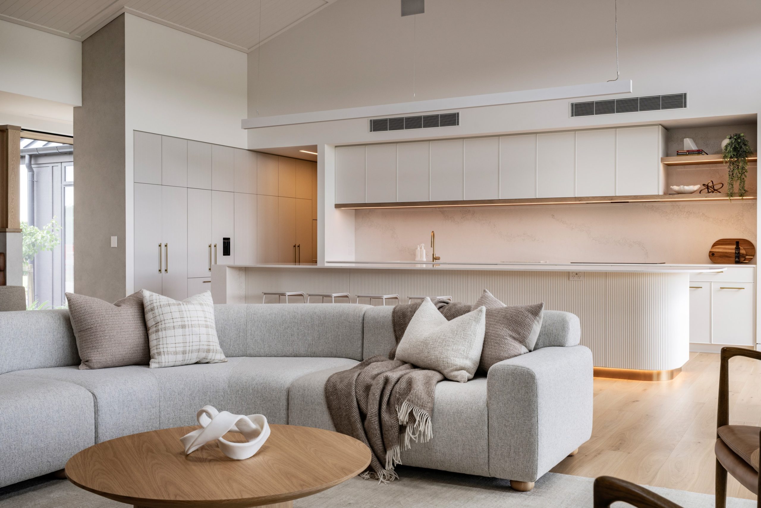 Subtle, curved design elements weave through the home, softening transitions and adding sculptural interest. From the main living space to the kids’ rumpus room, every corner is considered, with layers of texture, colour, and light creating harmony between function and beauty. The result achieves an interior that is both calming and dynamic, fitting for a home with three young girls and two creative-minded adults.