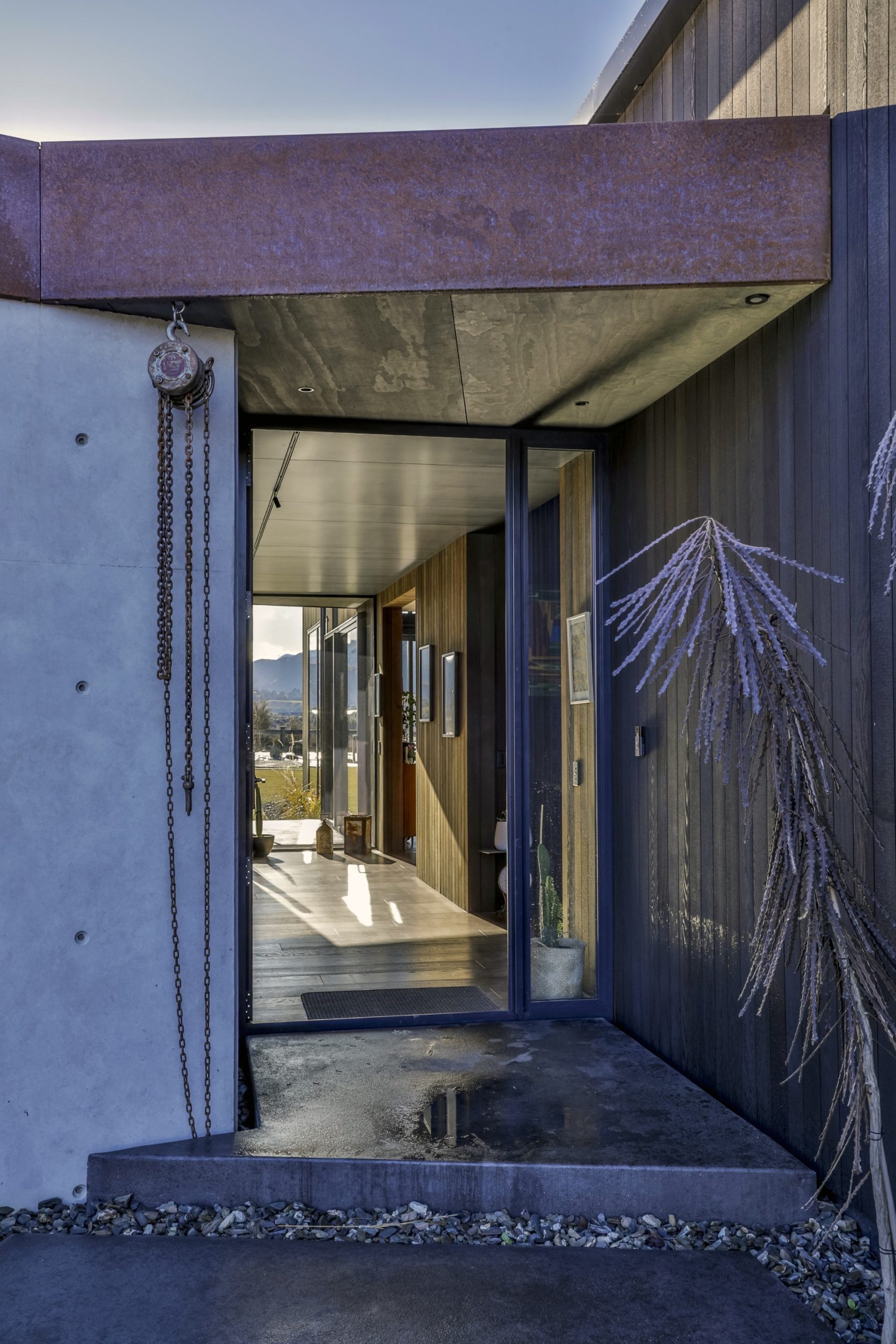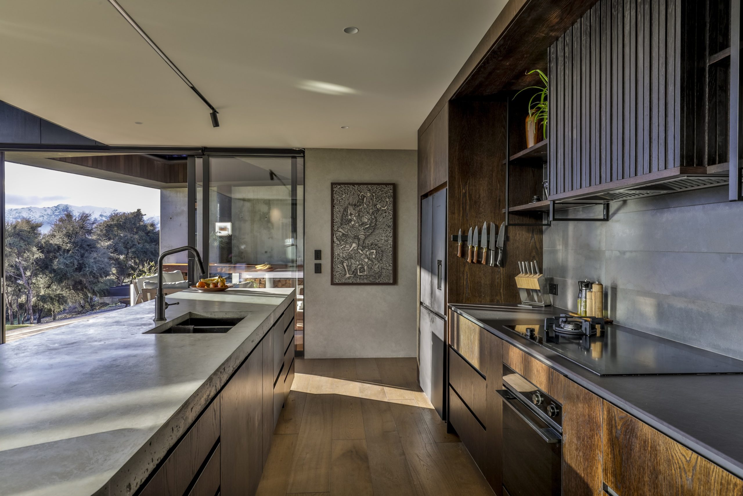 The building mass is wrapped around the existing gully, brimming with kānuka trees, a natural element that Bryce Monk of Threefold Architecture says defines the home’s identity. Looking north to Mt. Maude and west to Mt. Iron, the home’s heart soaks in the Otago sun. Positioned with future projects in mind, ample space surrounds the workshop and garage, and the expansive lawn is large enough to one day become a tennis court.