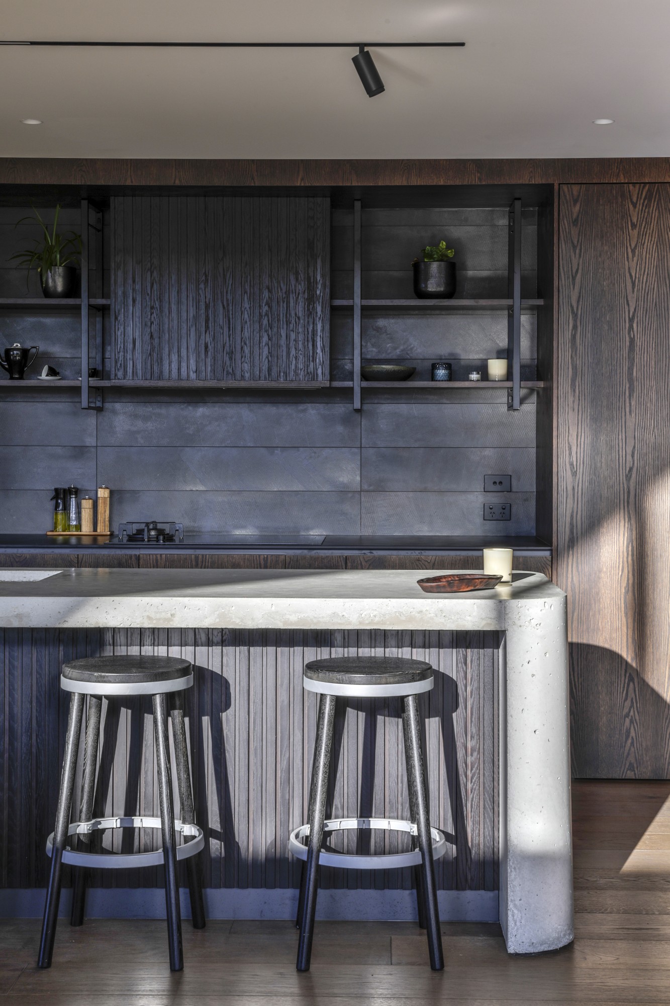 Bringing the homeowners’ joinery vision to life was a highlight of the year for Steadfast Joinery. Initial consultation meetings were held almost a year before installation, and by having the homeowner’s vision and hands-on involvement, coupled with Steadfast’s technical and design input, they were able to create something pretty special. The kitchen itself is a striking balance of dark natural timber panelling and veneers married with hard concrete surfaces to create a sense of warmth and structure.