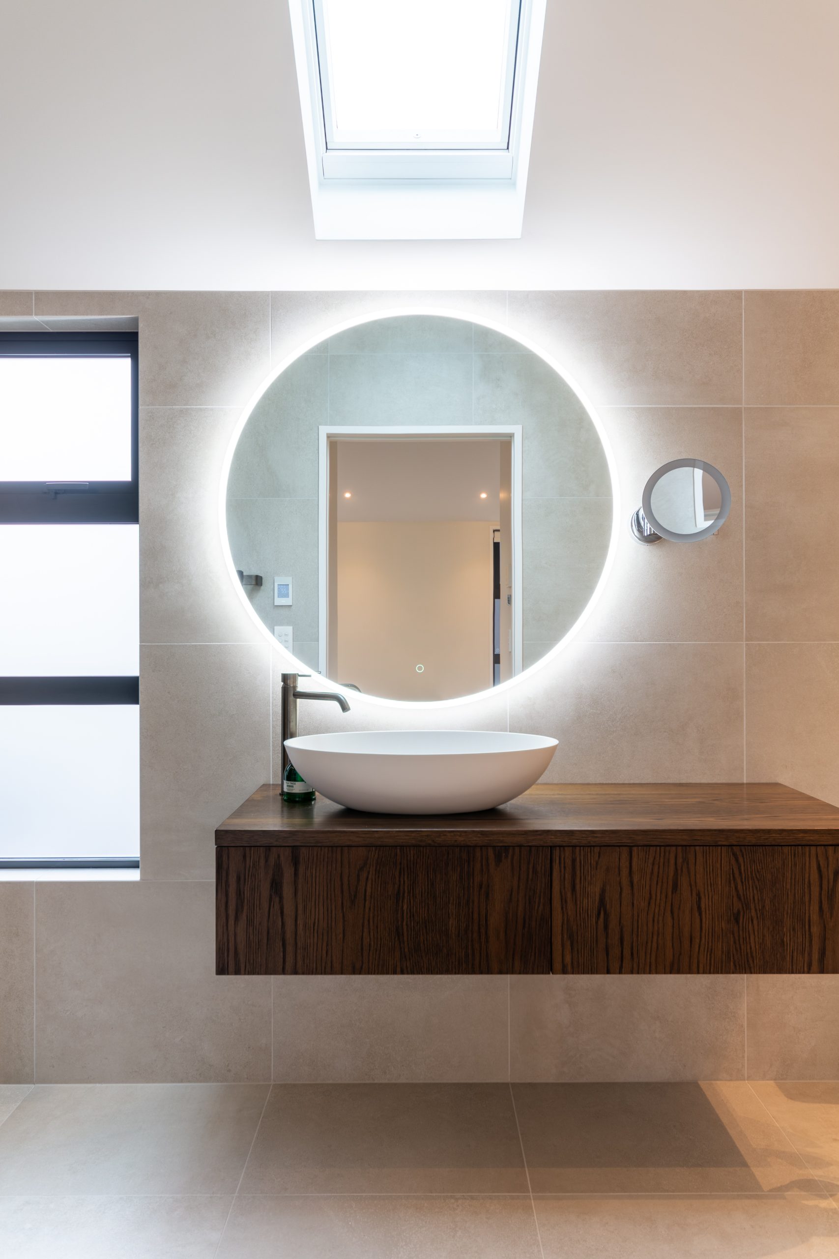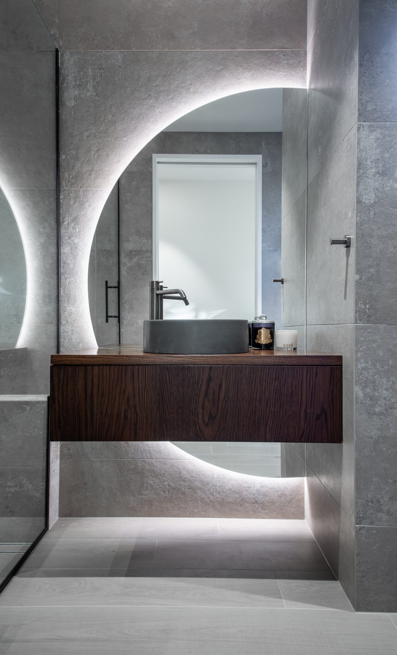 “There’s a guest suite on the left, which is co-joined but can be completely independent of the house. The guest suite bathroom is my favourite bathroom we’ve done. It has moody, dark tiles and a mirror that wraps around underneath the vanity,” Richard shares, his pride in their work evident.