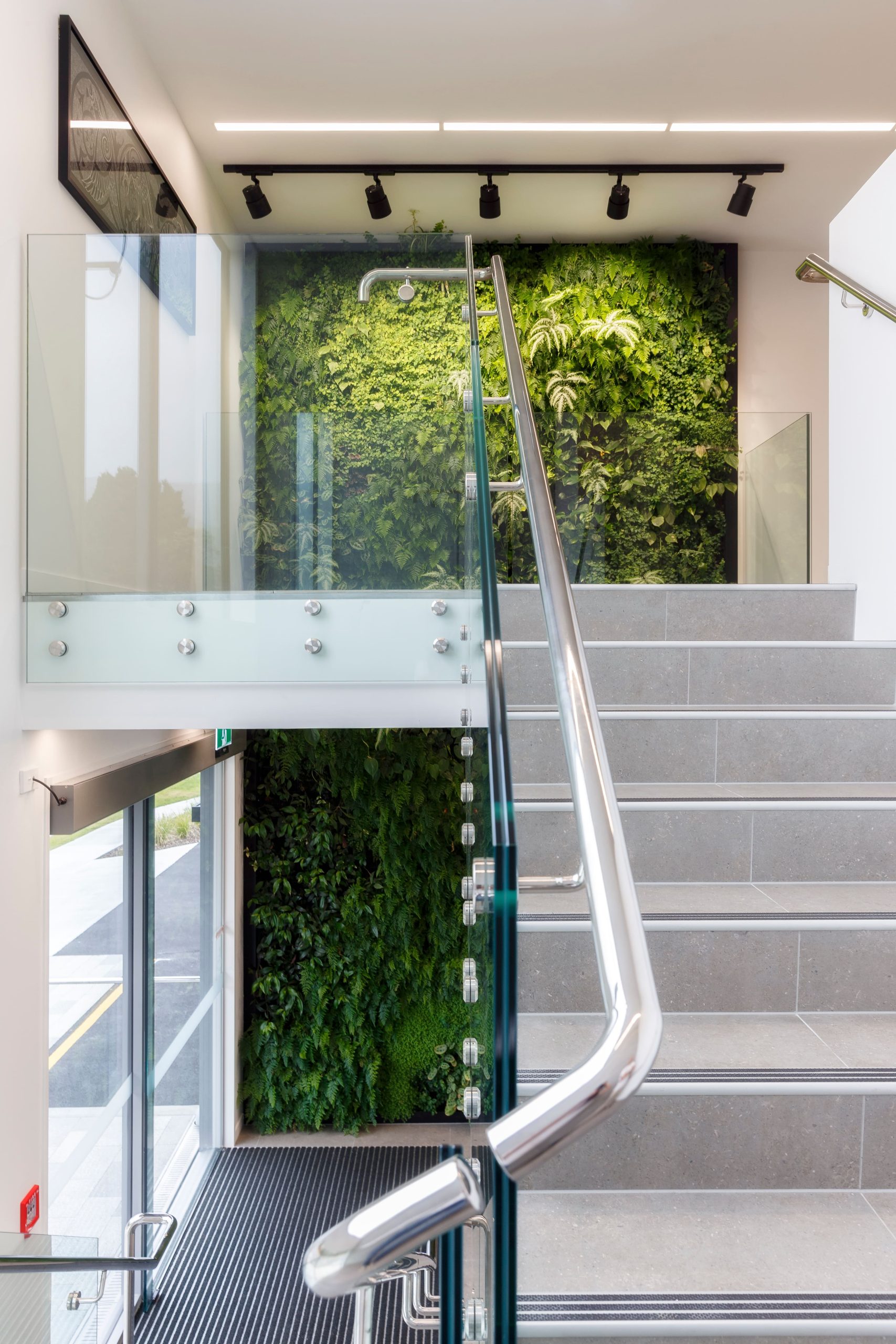 Sustainability was a big focus for the project. The use of cycle stands and electric car chargers encourages eco-friendly transportation choices. A substantial solar panel system on the roof helps offset electricity usage, while durable, low-maintenance materials like aluminium cladding minimises environmental impact. The building even has a living green wall that filters air and regulates internal temperatures, further contributing to a healthy environment.