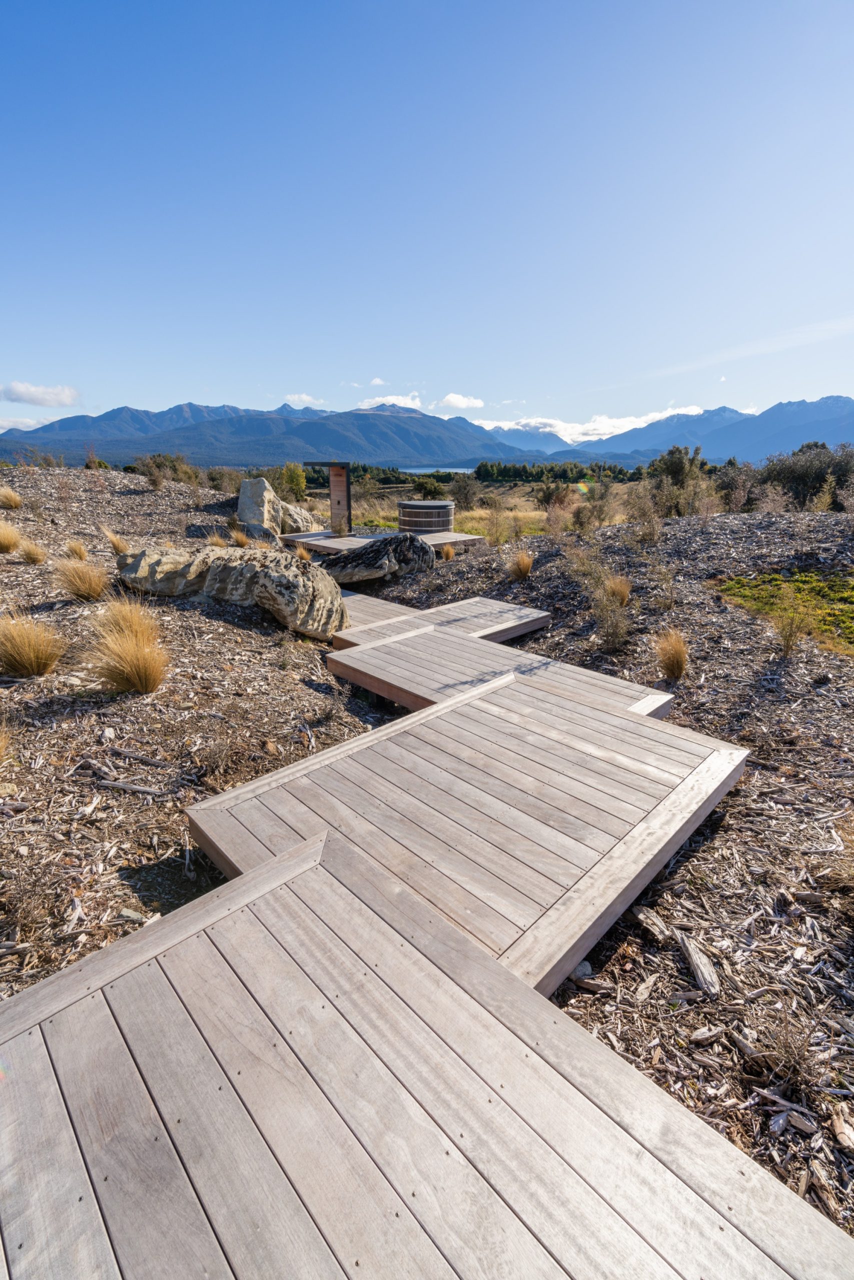 Careful terraforming and renaturalisation ensure the home suits its surroundings, accentuated by rigorous landscaping and planting by the homeowners. Decking snakes to an outdoor shower and spa where one can luxuriate in vast New Zealand flora.