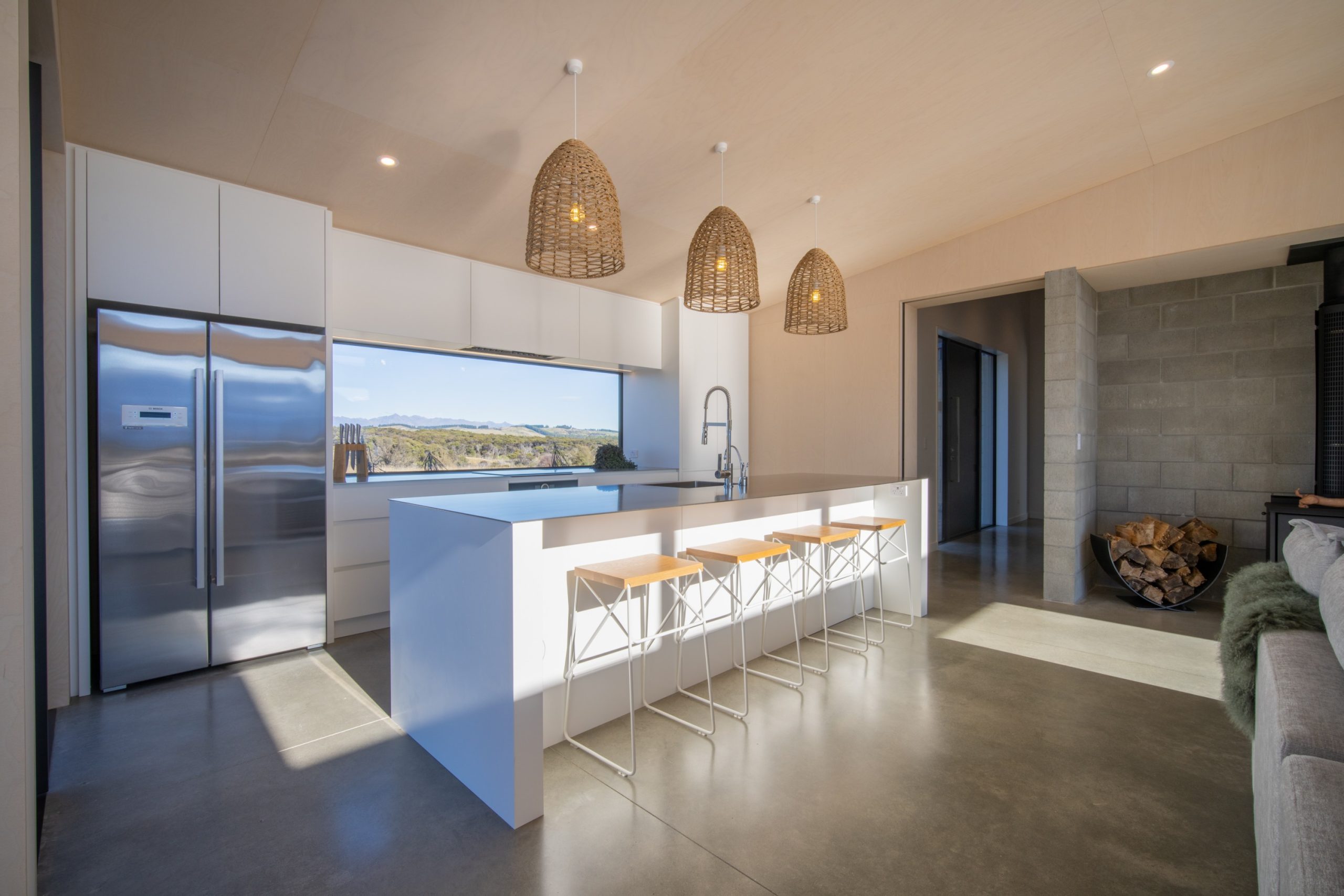 Like the exterior, which reflects its craggy surroundings, minimalist choices inside let natural textures shine. The streamlined kitchen features a window splashback that basks in southern views. Birch ply walls with negative detailing underline the home’s character: an inviting retreat informed texturally by its unforgiving native environment. Clean lines and dusty colours fashion an interior that epitomises understated glory.
