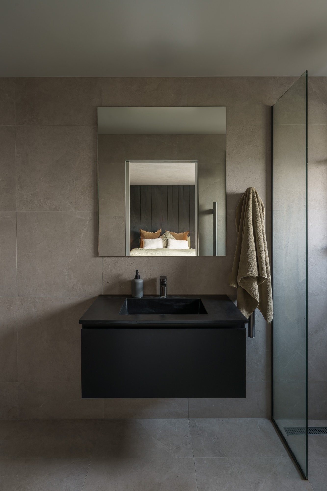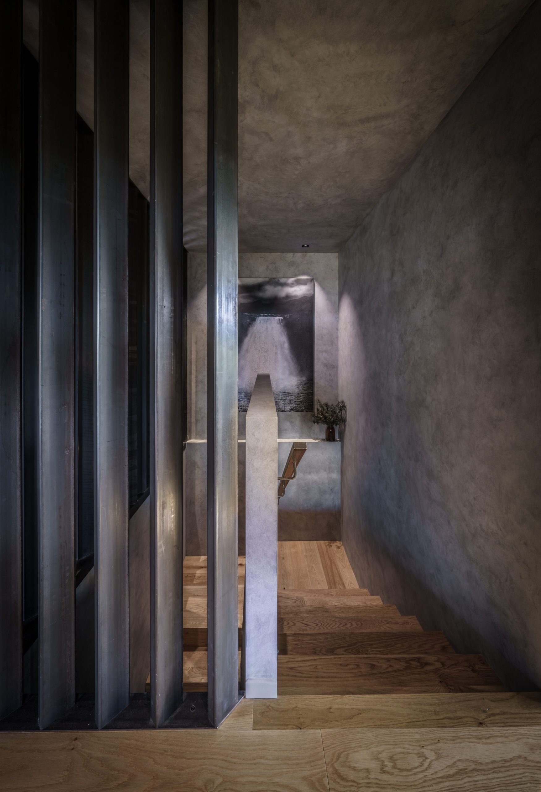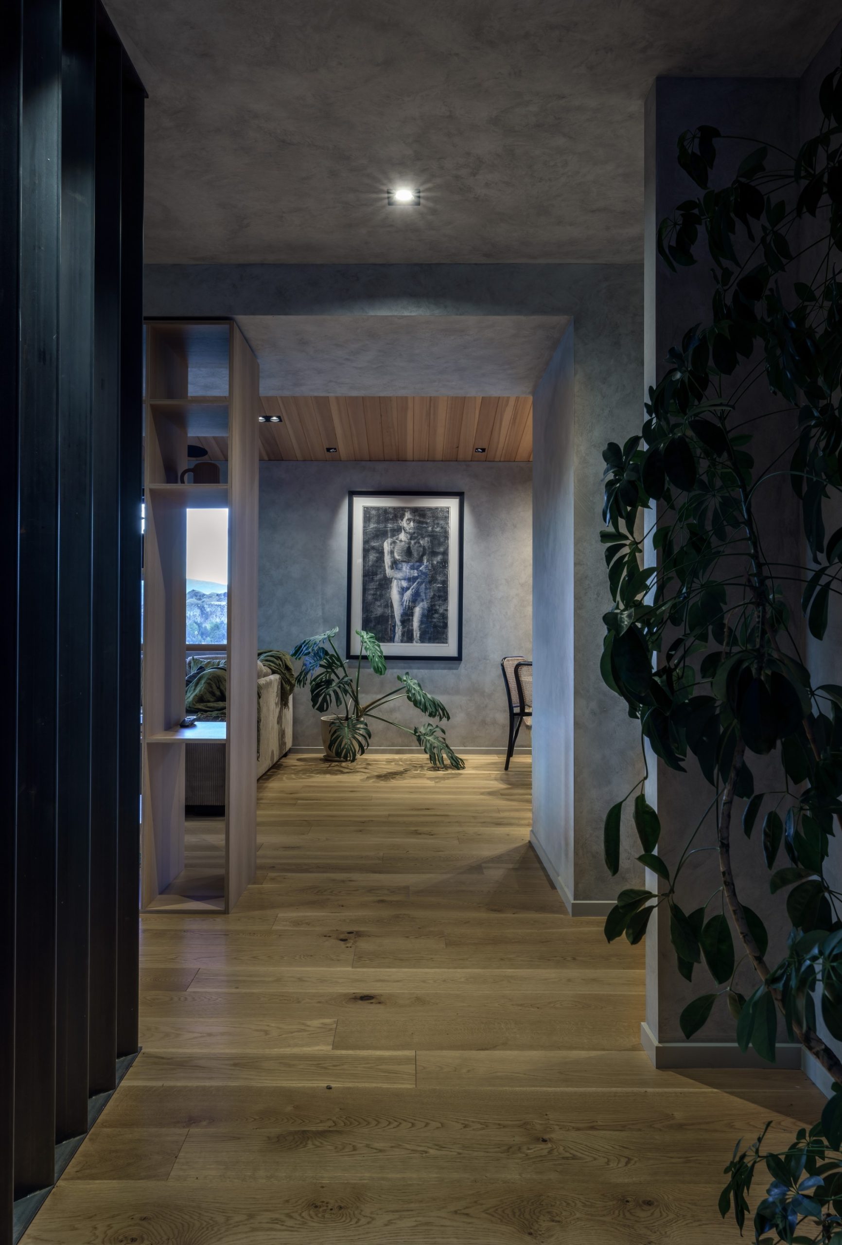 The walls are painted with a French wash, which gives the illusion of concrete. There is also a timber ceiling in the kitchen-living and an open-shelf style oak TV partition wall. Downstairs was designed to be a retreat for sleeping, and the walls are dark timber.
