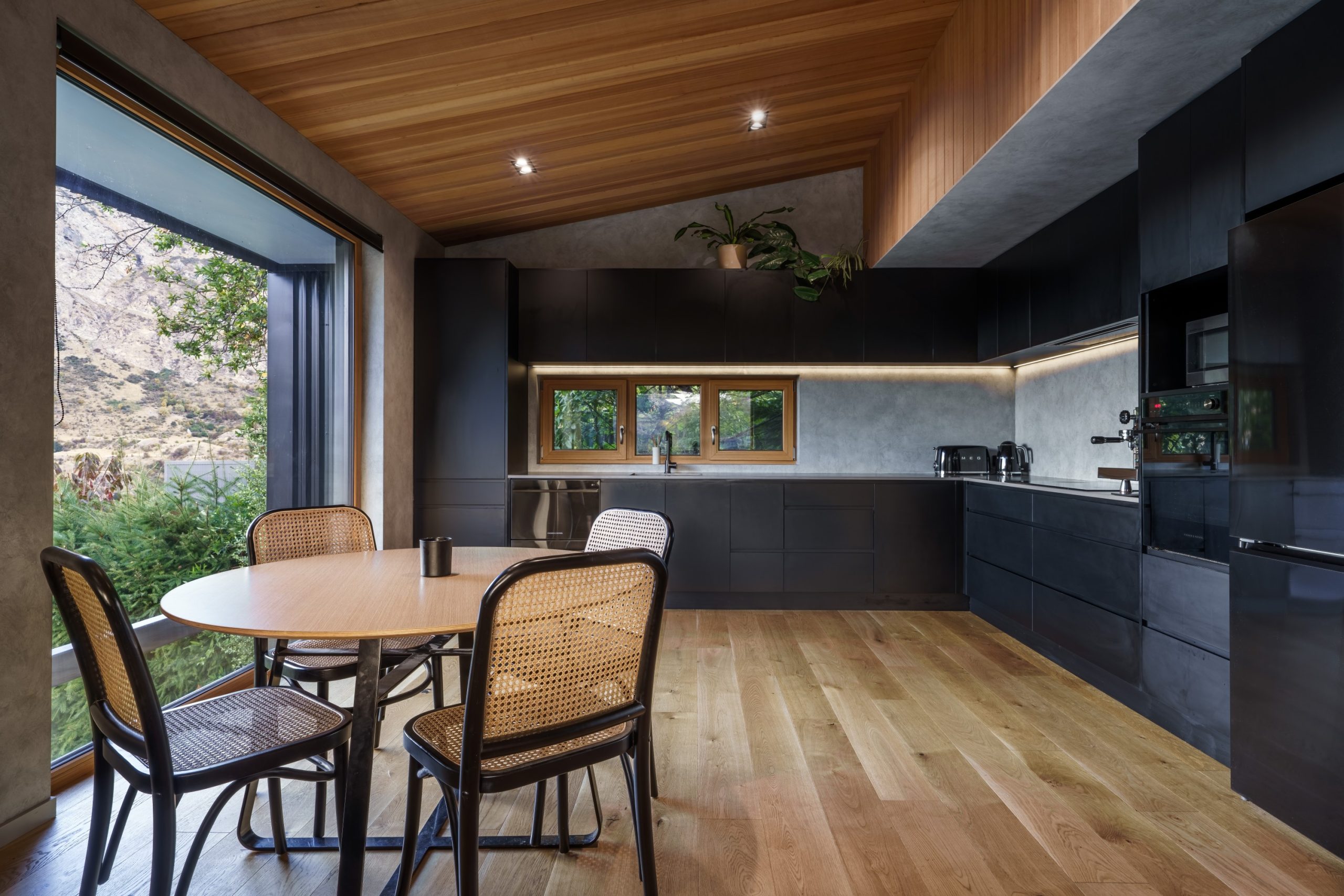 Nestled amongst the greenery of the mountains in Queenstown is a home which embodies the essence of passive homes. Josh and Drew Atkins, who founded Compound Building back in 2017, say that they built this project titled ‘Moonlight Tui’ as an “exercise in designing and building a house that we believe to afford the inhabitants with a comfortable and healthy environment, that was warm in the winter and good in the summer.” Josh and Drew built this home for themselves, as they “strongly believe that the building code produces a low-quality and poor-performing home”, Drew says. With the site being moderate to steep and access being from a narrow street, the first challenge was to model different orientations, wall