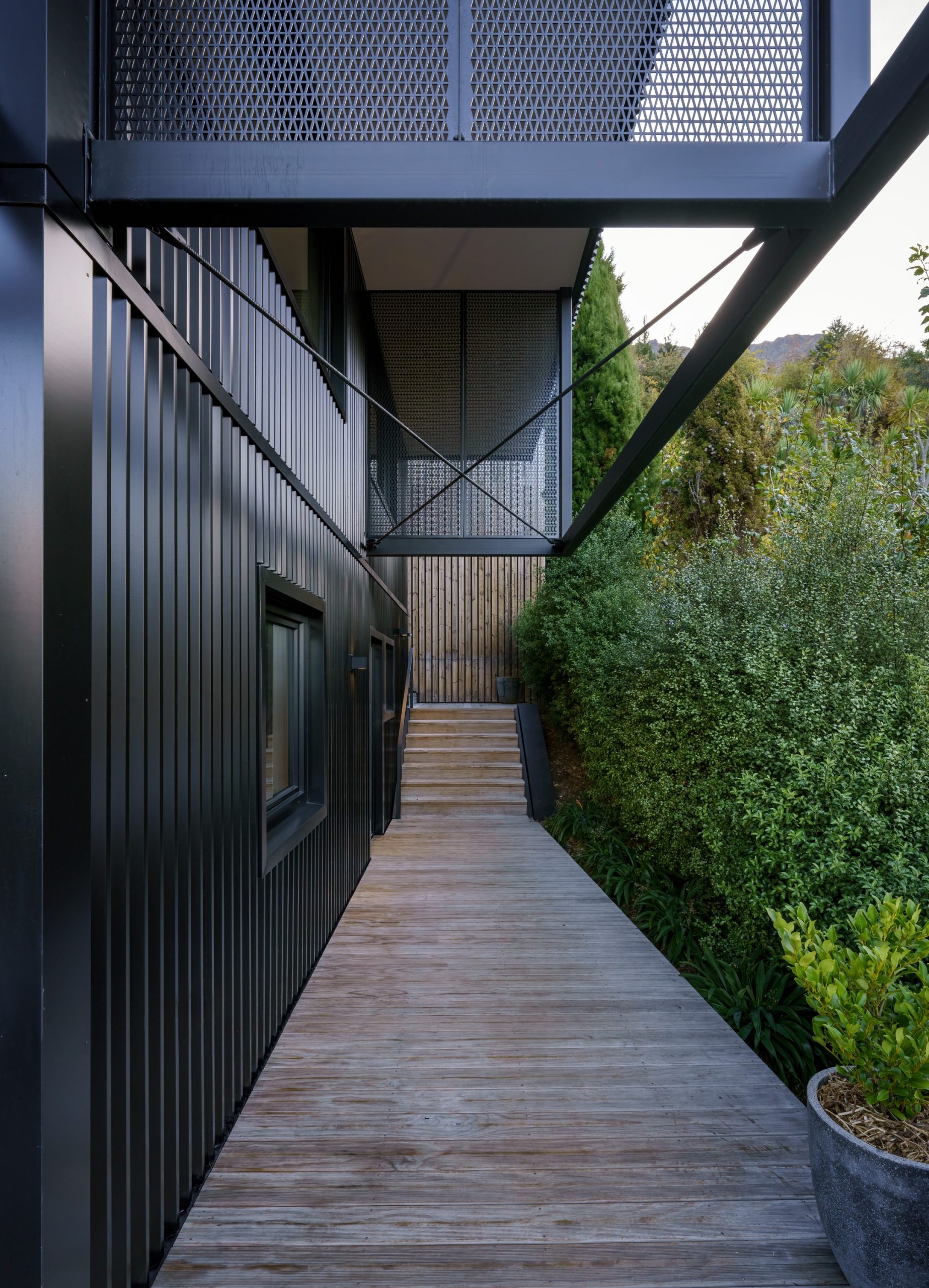 Entry is via the timber-clad carport, where you go down a timber stairway to the entrance of the home. The decking wraps around the house and steps down with the site’s slope as you follow it around to the large deck on the north-west side of the property. The home is made up of an insulated concrete foundation, poly-block walls to the lower level, and timber walls and roof above. Windows and doors are thermally broken UPVc, and the cladding is a metal-profiled wall and roof, with a stunning timber-batten carport. Drew says, “The materials were chosen for their performance, and the timber battens provide a softness to the entry of the home.”
