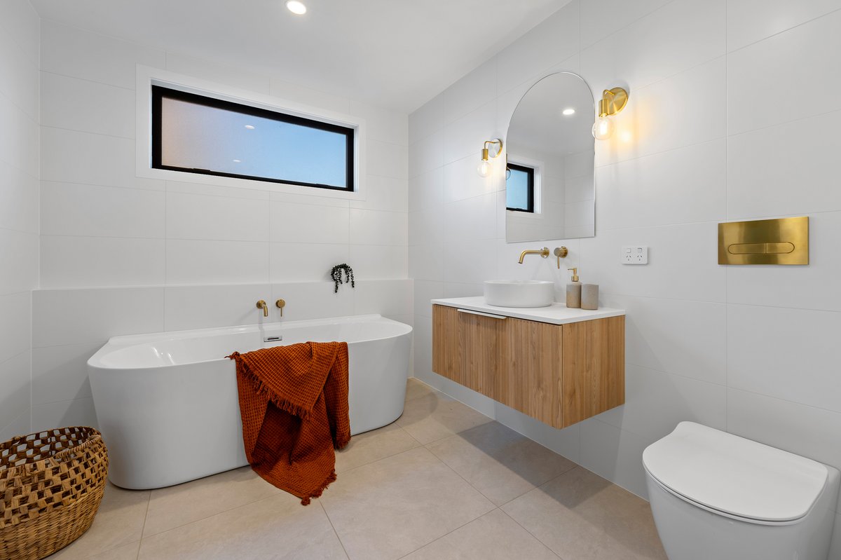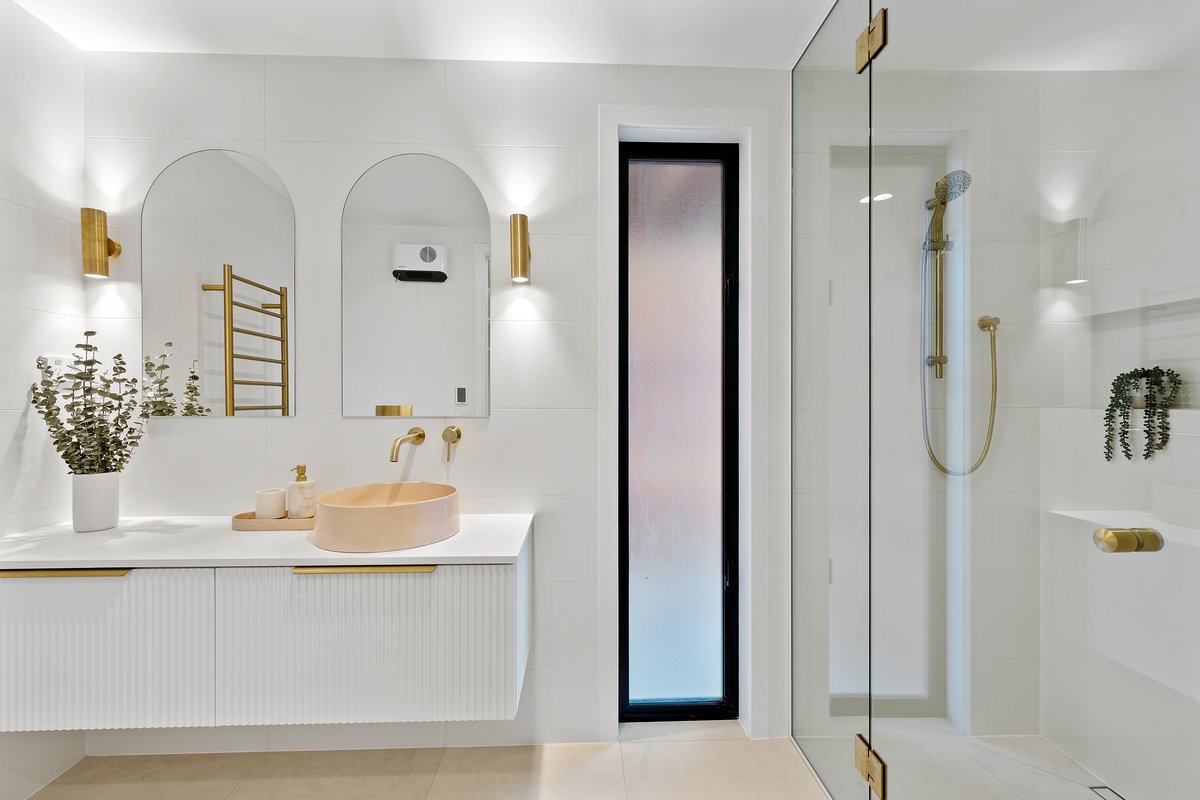 The interior ambiance is meticulously curated, employing a warm colour palette complemented by pendant light fixtures, brushed brass tapware gracing vessel basins, arched mirrors, and a judicious selection of natural wood accents and opulent bathroom tiles, culminating in a harmonious and sumptuous living environment.