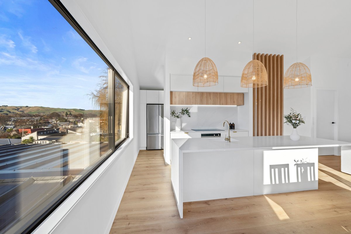 The pitched raised ceiling, adorned with thermally broken aluminium window frames and premium glazing, accentuates the east-facing window, inviting natural light to flood the space.