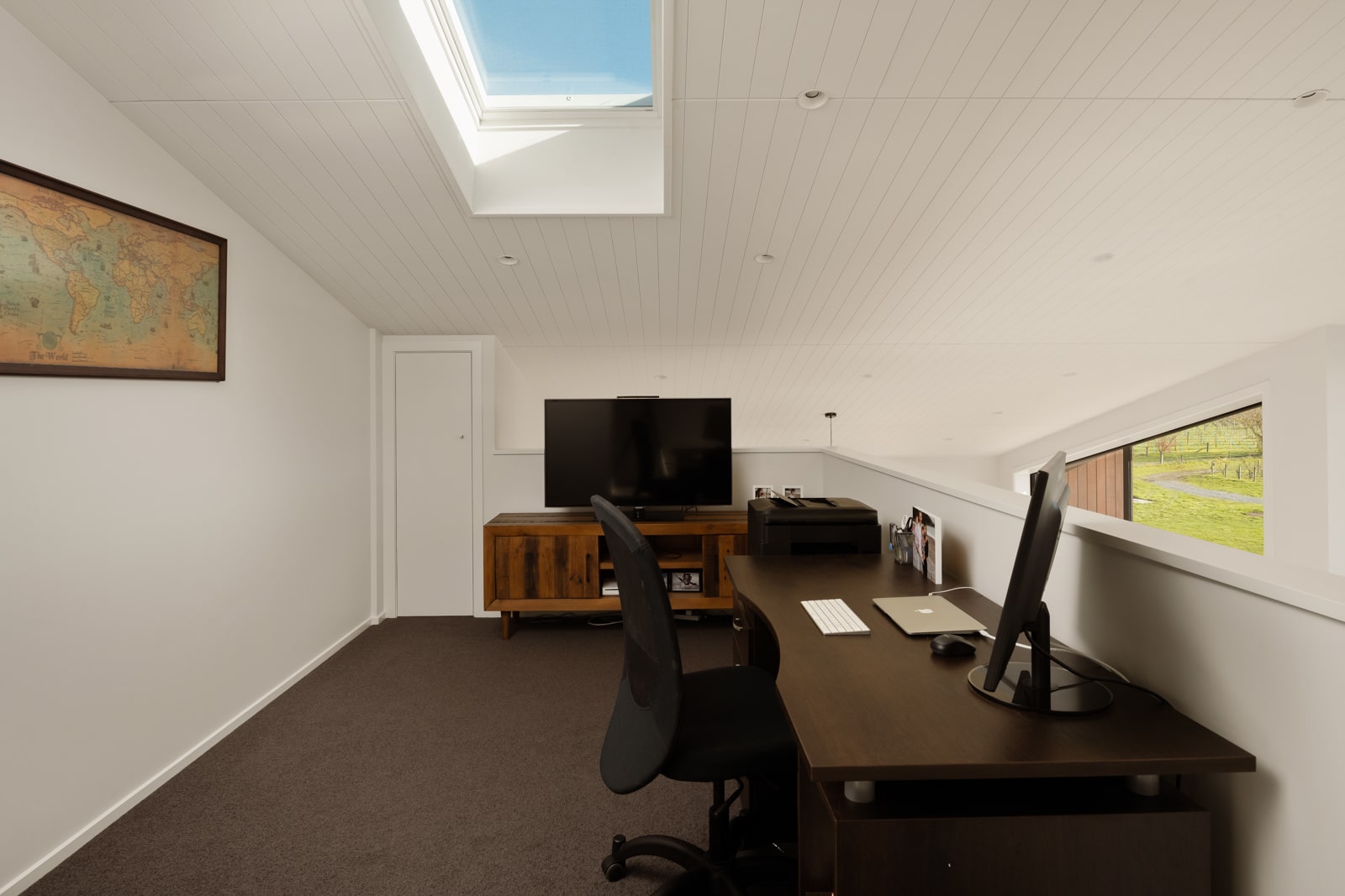 Thanks to its high raftered ceilings, the mezzanine office is perfectly situated in this property. Its exterior is wrapped in a distinctive asymmetrical design made of a combination of plaster and cedar.