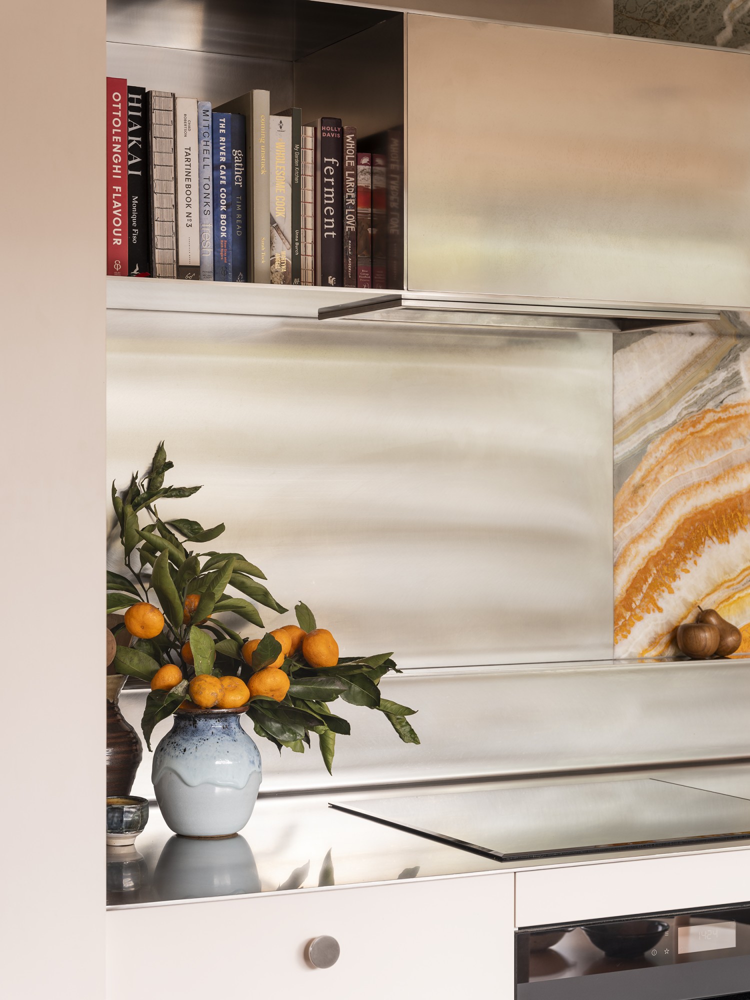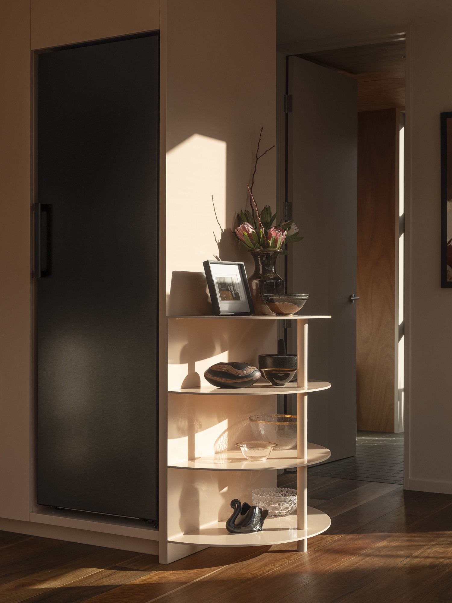 The standout joinery was done by A. One Kitchens + Interiors, including materials such as Laminex Melteca Porcelain Blush for the beige cabinetry below the bench, paired with Resene Romantic in a lacquered paint finish for the full-height cabinetry. A stainless-steel plate rotary with a Brushed Finish was used for the main benchtop, as well as welded aluminium, painted with Resene Romantic, for the half-circular bench shelves. The main sink is a Mercer DV Sheffield DV403-3, which was welded into stainless steel.