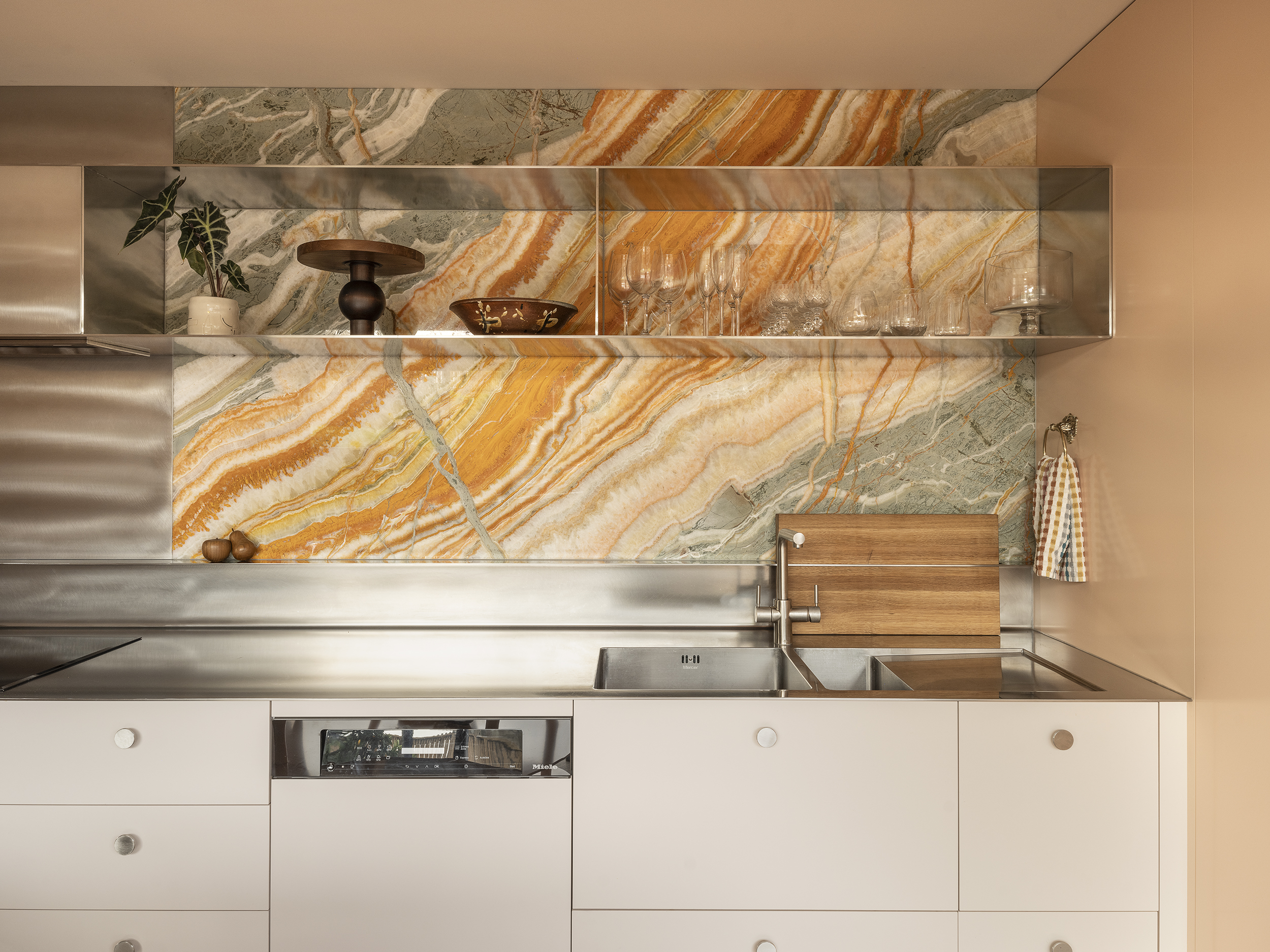 A favourite feature of the home for Jeremy was the stone splashback from SCE Stone and Design, which is a rainbow onyx. “It ties all of the other interior finishes together and is wildly loud, colourful and stunning all at the same time.”