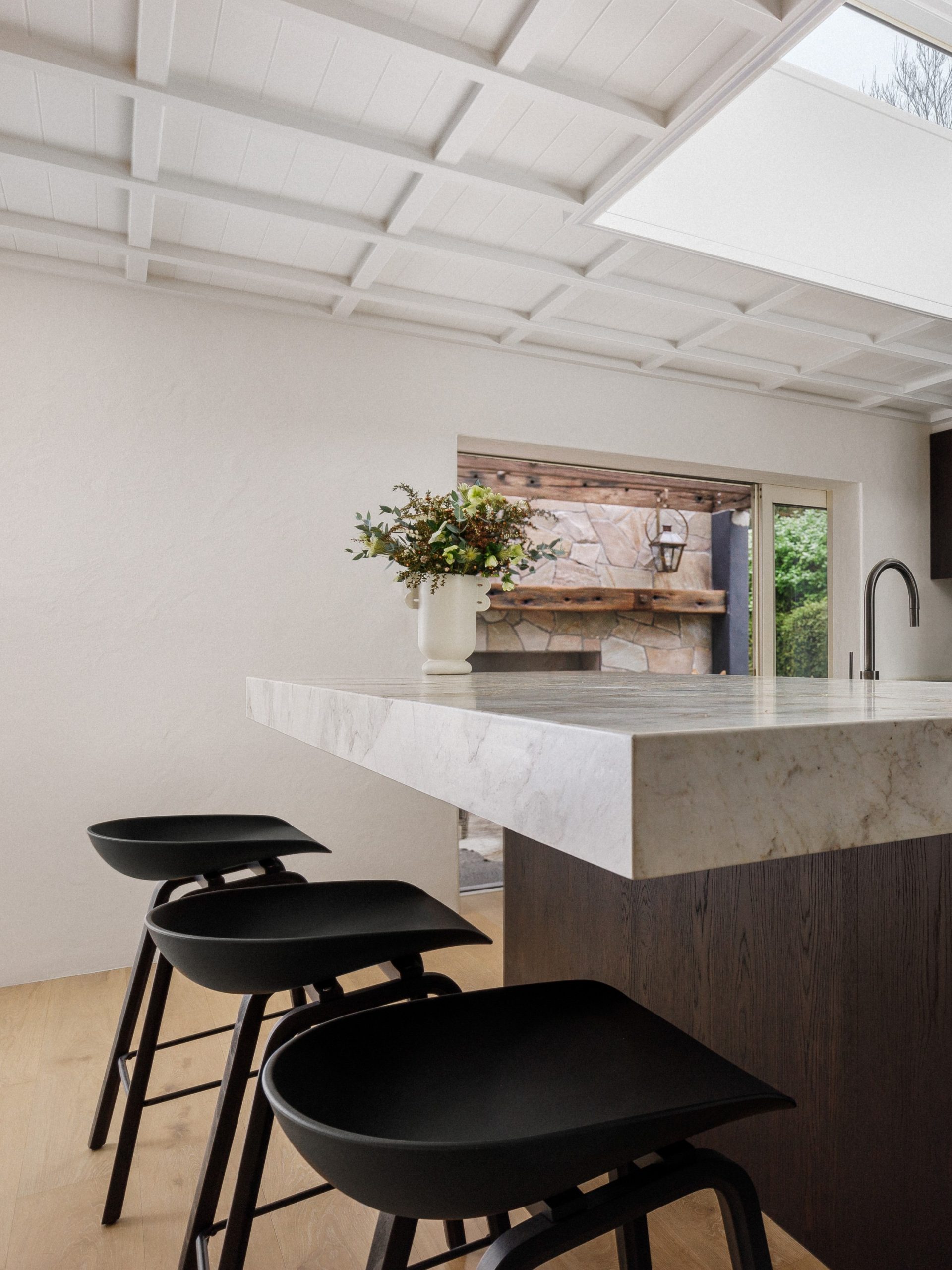 Among the standout elements is the cantilevered marble breakfast bar, a structural and aesthetic marvel, which takes centre stage as a striking visual statement. “We knew the legs would take away from the beauty,” Chelsey says. “It had to float.” The feature island, a central focal point of the design, showcases a stunning countertop in Matarazzo Stone—a durable and visually striking natural material